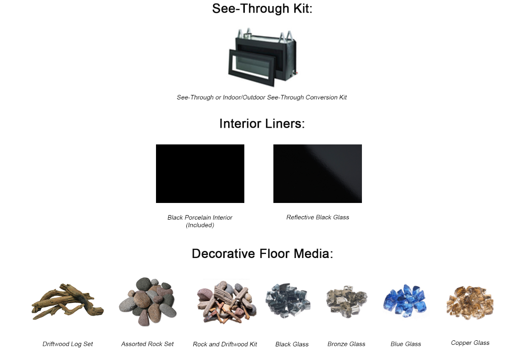 - Configuration Kit: Linear Direct Vent See-Through Conversion Kit, Linear Indoor/Outdoor See-Through Conversion Kit, HeatFlo Convection Air Circulation Kit (Optional)
