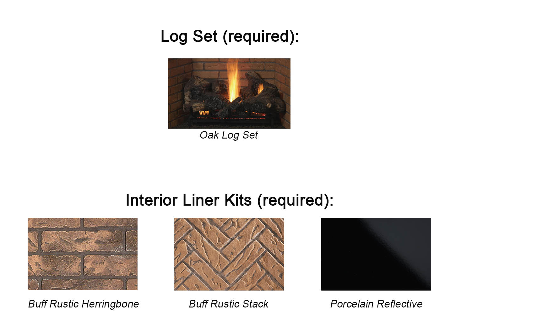 - Liner Kits: Porcelain Liner Kit, Buff Herringbone Ceramic Liner Kit, Buff Rustic Ceramic Liner Kit (Required)