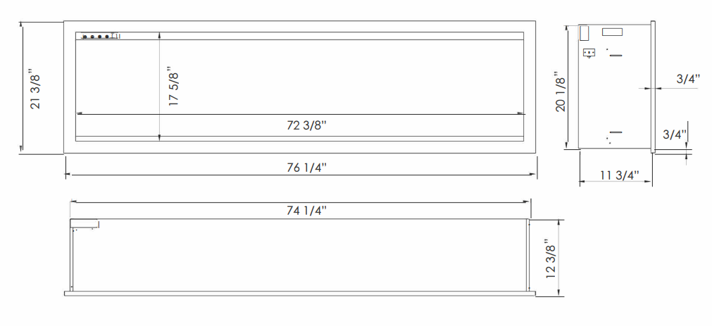 - Overall Dimensions: 74 1/4" W x 20 1/8" H x 11 3/4" D