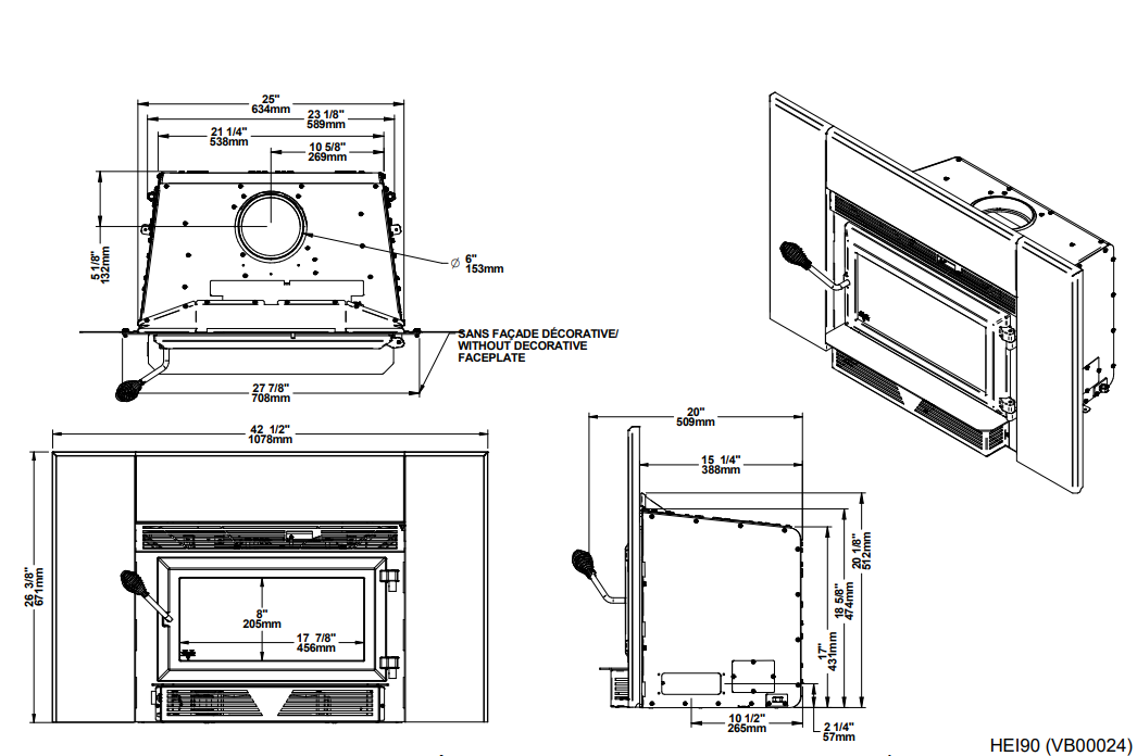 - Minimum fireplace opening: 19" H x 25" W x 15 1/2" D