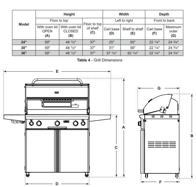 - Cooking / Backburner / Side Burner BTUs: 50,000 / 12,000 / 12,000