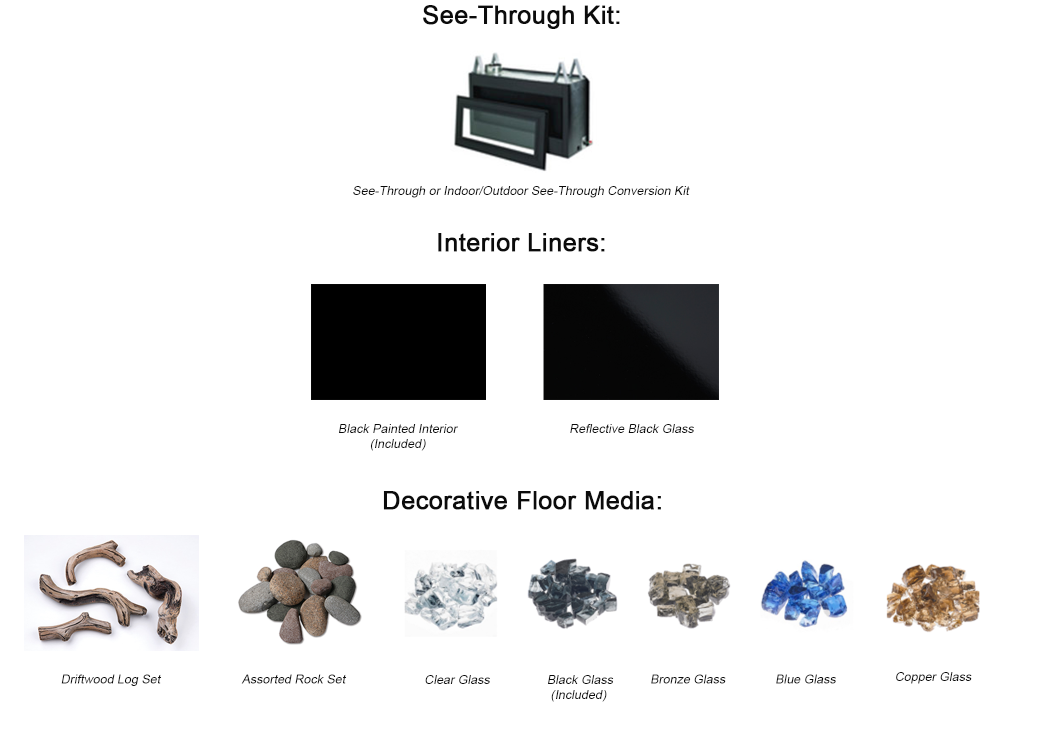 - Configuration Kit: Linear Direct Vent See-Through Conversion Kit, Linear Indoor/Outdoor See-Through Conversion Kit, HeatFlo Convection Air Circulation Kit (Optional)