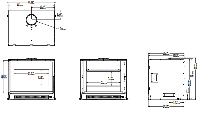 - Minimum fireplace opening required for insert installation: ~ 29″ W × 24 ⅝″ H × 20 ¾″ D