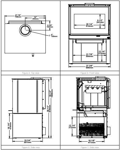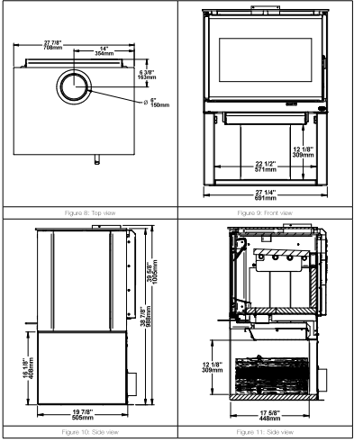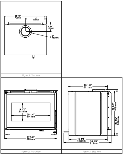 - Flue / chimney: 6″ diameter flue outlet / chimney required