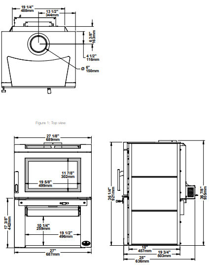 - Chimney / flue: 6″ diameter outlet; chimney must meet CAN/ULC S629, UL 103 HT (2100 °F) specs