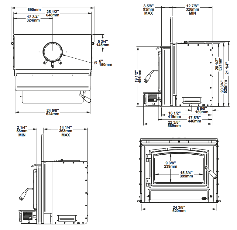 - Chimney / flue: requires 6″ diameter flue (compliant with CAN/ULC S629 / UL103 HT)