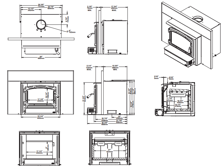 - Minimum fireplace opening required: ~ 23-3/8″ H × 28-7/8″ W × 15-3/4″ D
