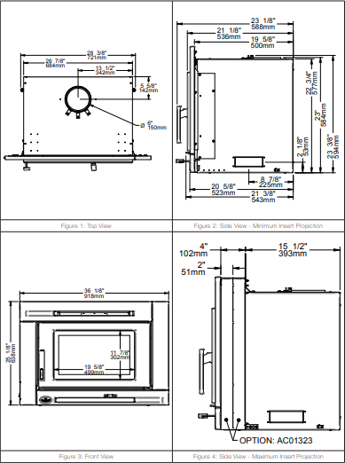 - Minimum Fireplace Opening: 23 3/8" H x 28 7/8" W x 19 5/8" D