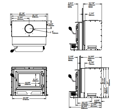 - Minimum fireplace opening: 27 1/2" W x 21 1/2" H x 12 3/4" D