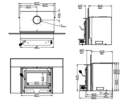 - Minimum fireplace opening: 28 7/8" W x 23 3/8" H x 15 3/4" D